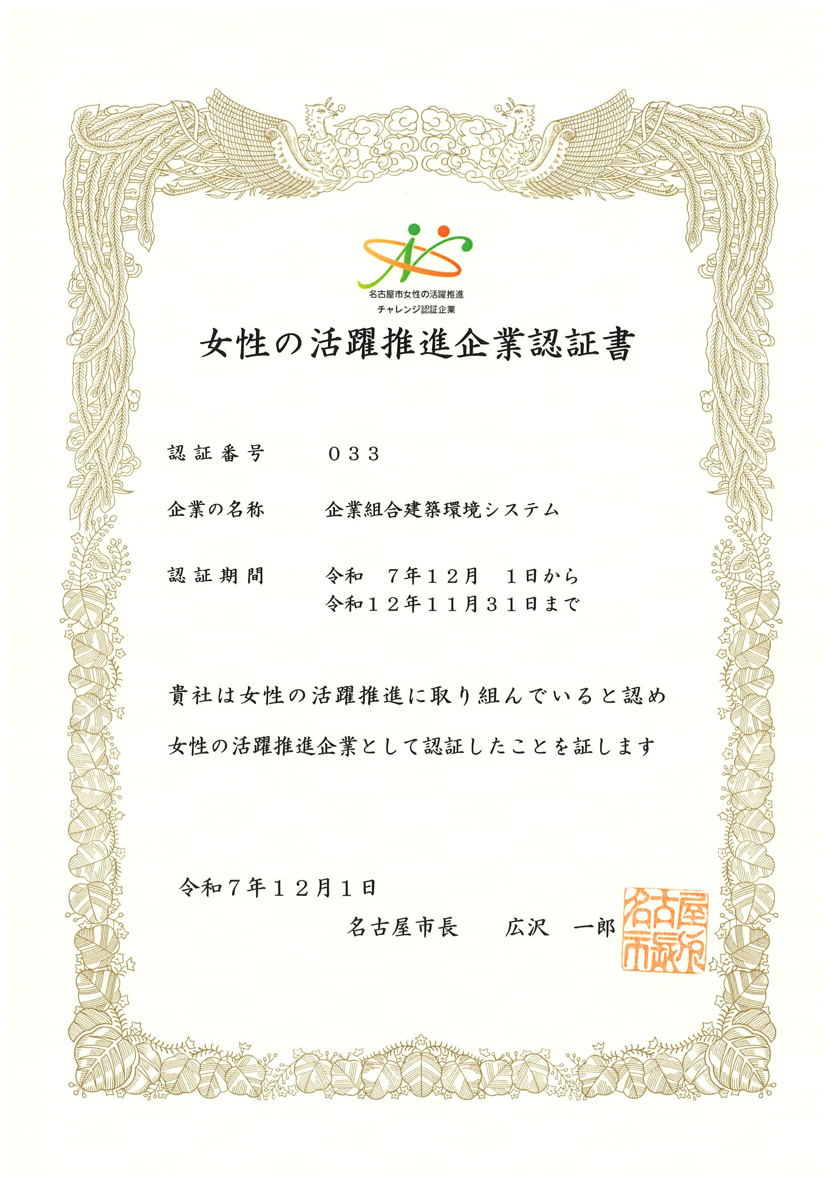 名古屋市女性の活躍推進企業に認証を更新されました。