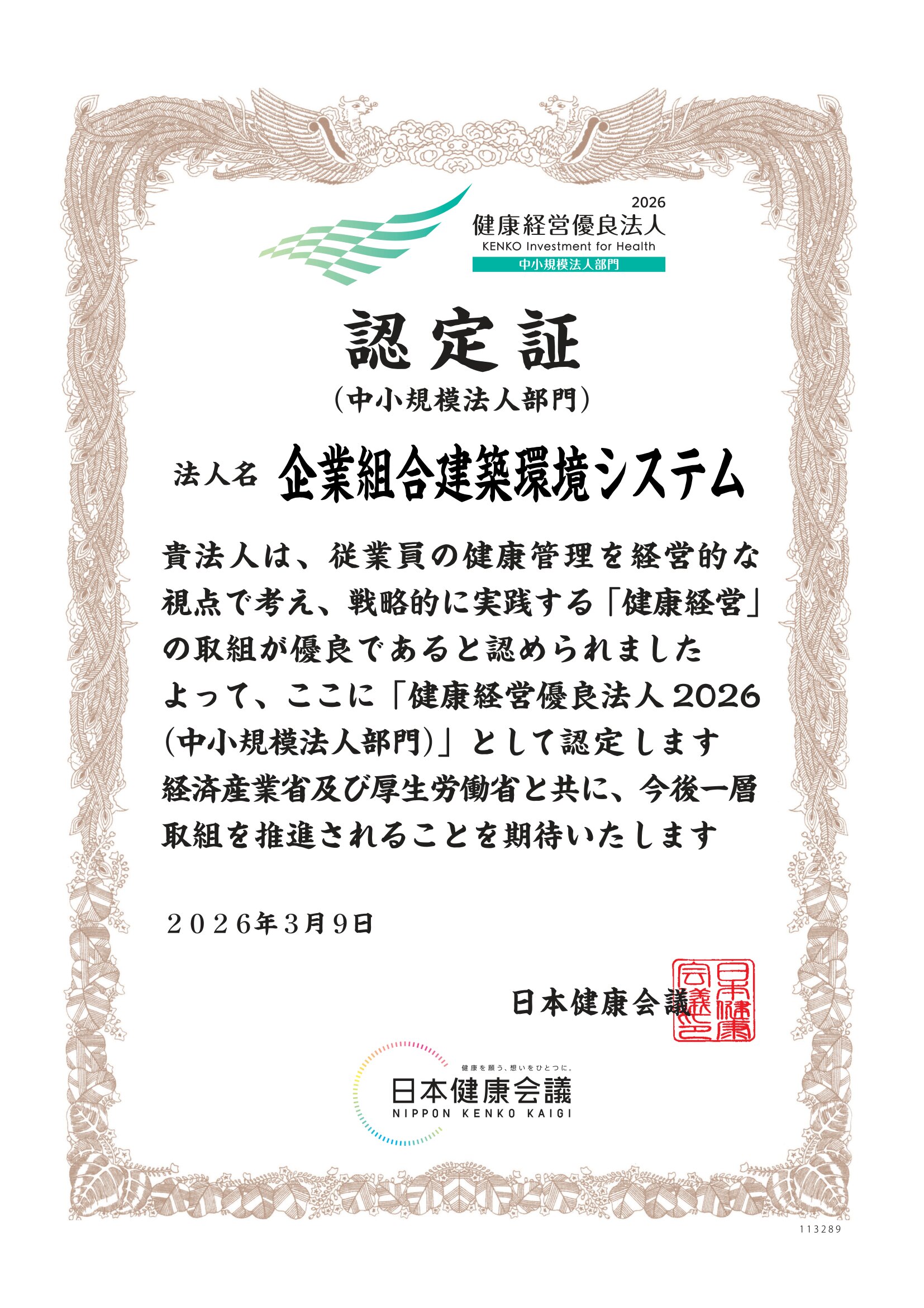 経済産業省と日本健康会議が共同で選定する『健康経営優良法人2026(中小規模法人部門)』に認定されました。 今後も、従業員の健康管理を経営的な視点で考え、戦略的に実践することで、全従業員の健康維持増進に向けた取り組みを行います。